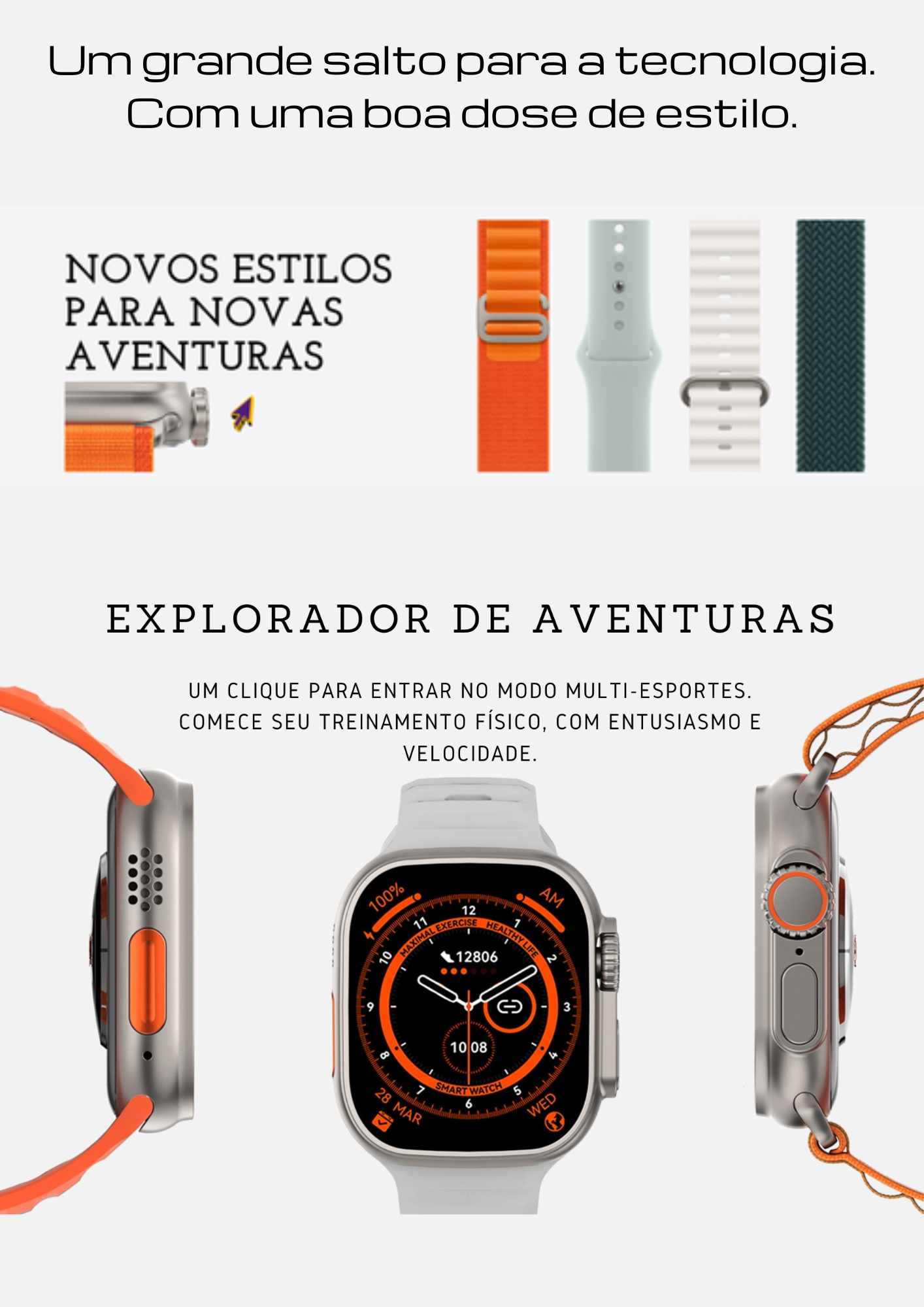 O Smartwatch T800 Serie 8 Ultra® é um Relógio Completo. Ele tem muitas atribuições e funcionalidades, possui Monitor de Saúde, Foto como papel de parede, notificações de rede social, câmera remota, agenda telefônica, NFC e resistência a água.